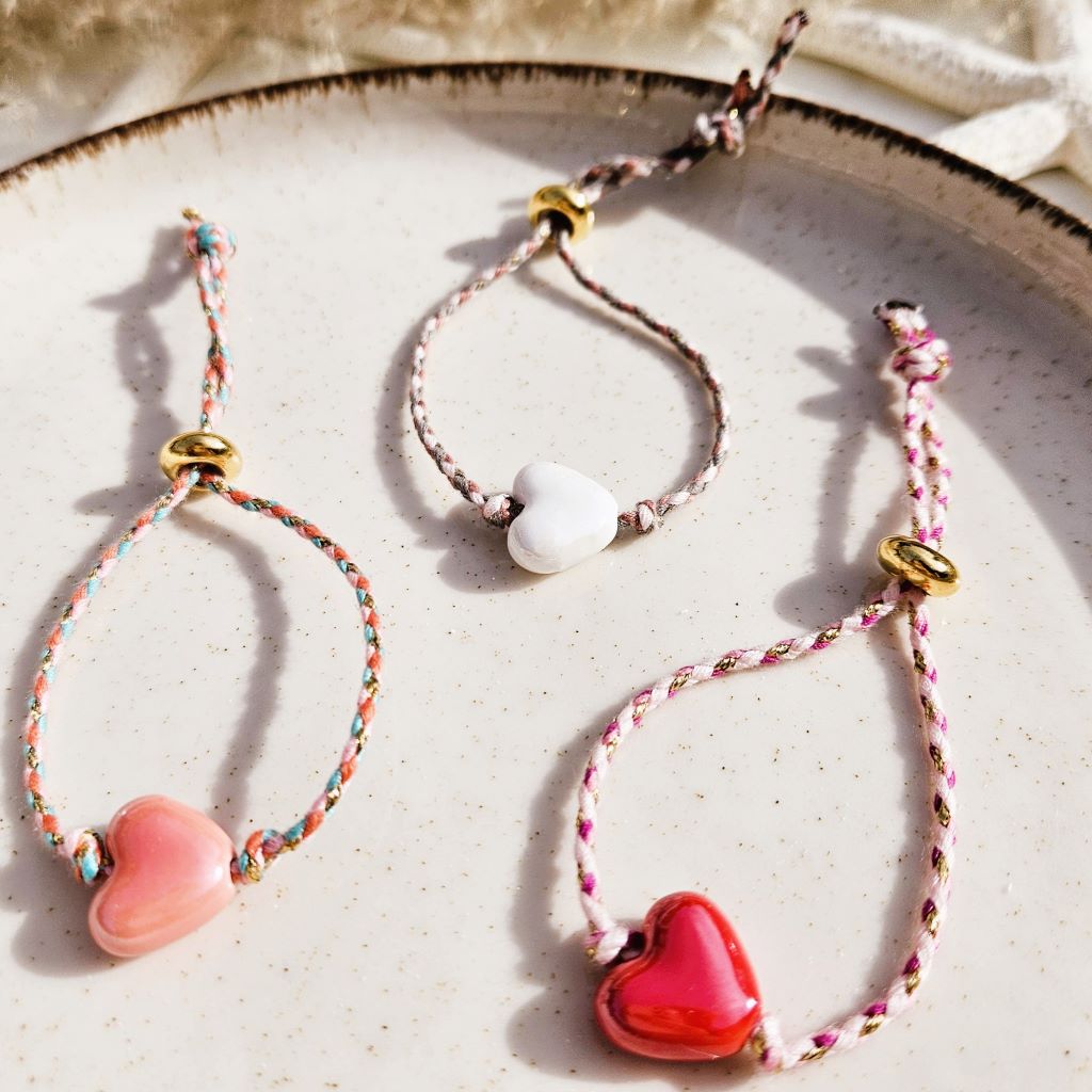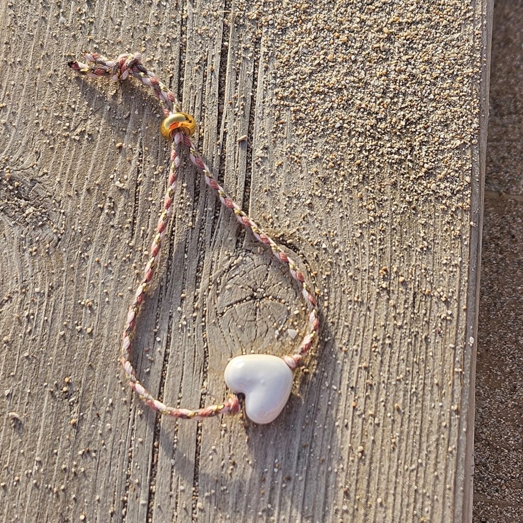 Fijn armband van glitter koord met een wit hartje en afgewerkt met een gouden kraal. De gouden kraal is van gold plated materiaal.